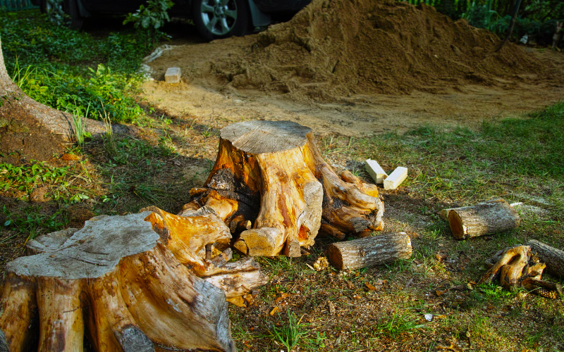 Older Tiegs Corner yards may have three or four stumps from past removals. Previous owners often cut trees at ground level and left the roots. These obstacles create dead spots in lawns and attract carpenter ants.